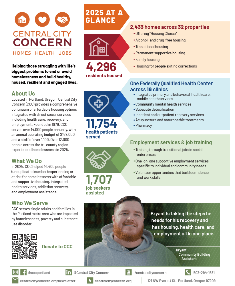 Homelessness is a complex but solvable challenge. In these pages, you’ll find Central City Concern’s 2023-2026 Strategic Plan which outlines our measurable goals and strategies addressing what it will take. Together, let’s end homelessness and ensure a healthier, equitable and more resilient future for all Oregonians.